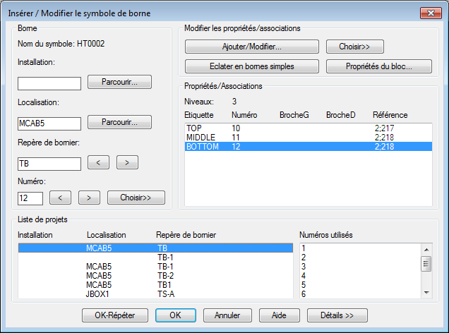 Les affectations de niveaux s'affichent dans la section Propriétés/Associations de la boîte de dialogue Insérer/Modifier le symbole de borne. Notez que la borne est sur 3 niveaux et que les niveaux 1 et 2 et sont désormais affectés.