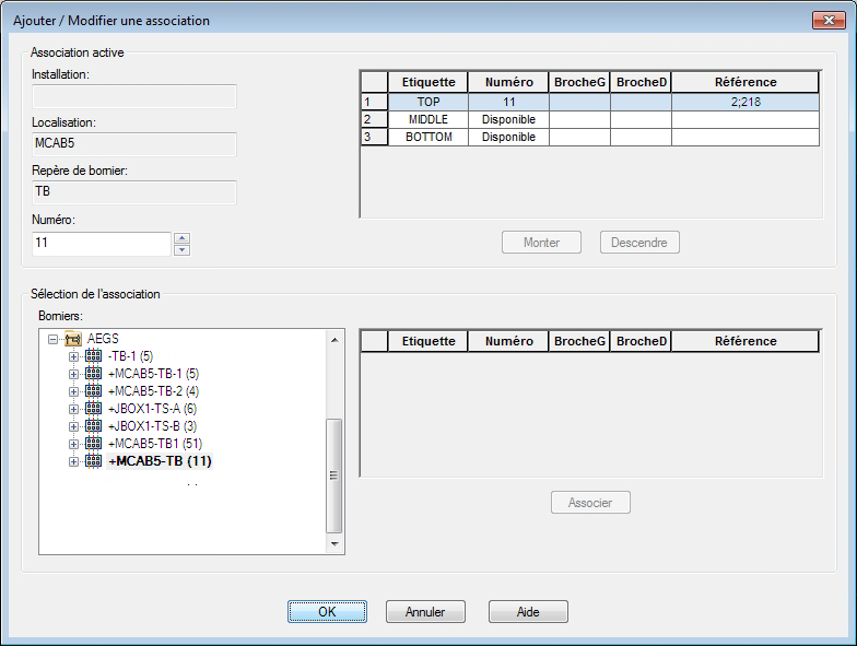 Le niveau inférieur se met alors à jour avec le numéro de la borne dans la grille dans la section Association active de la boîte de dialogue. Vous pouvez réorganiser les niveaux en sélectionnant un niveau et en cliquant sur Monter ou Descendre.