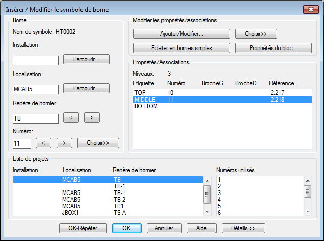 Dans la section Liste de projets de la boîte de dialogue Insérer/Modifier le symbole de borne, sélectionnez le repère de bornier TB.