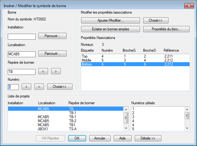 Dans la section Propriétés/Associations de la boîte de dialogue Insérer/Modifier le symbole de borne, les trois niveaux sont affectés. Vous pouvez maintenant déplacer une borne vers un autre niveau à l'aide de la boîte de dialogue Ajouter/Modifier une association.