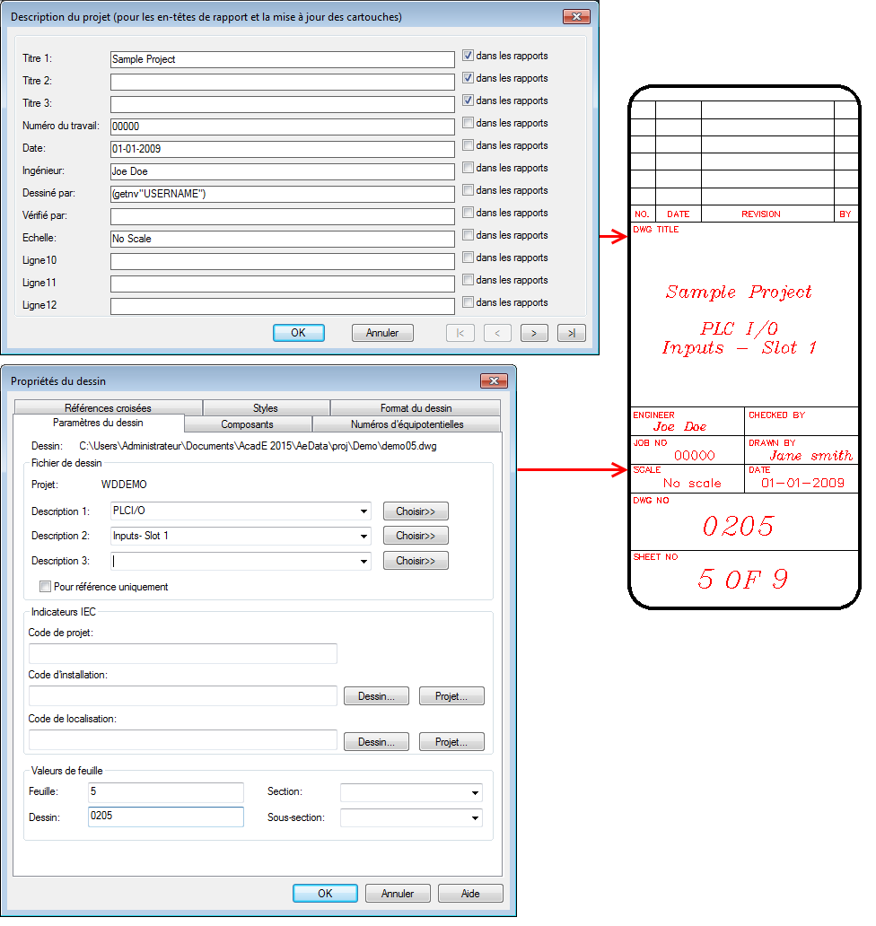 Utilisez la fonction de configuration du cartouche pour mapper les valeurs spécifiques de projet et de dessin ci-dessous aux attributs du cartouche.