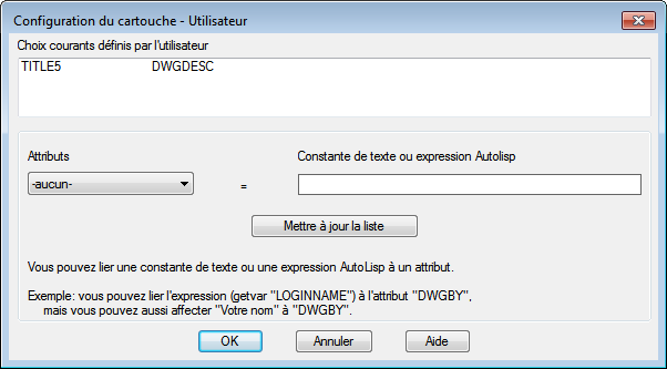 Vous pouvez associer les valeurs de la variable système ou les valeurs extraites par les programmes AutoLISP à des attributs du cartouche.