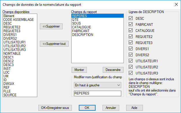 Modifier champs du rapport : ouvre une boîte de dialogue, dans laquelle vous pouvez spécifier les champs à inclure dans le rapport, leur ordre d’affichage, les étiquettes et les paramètres de justification du texte.