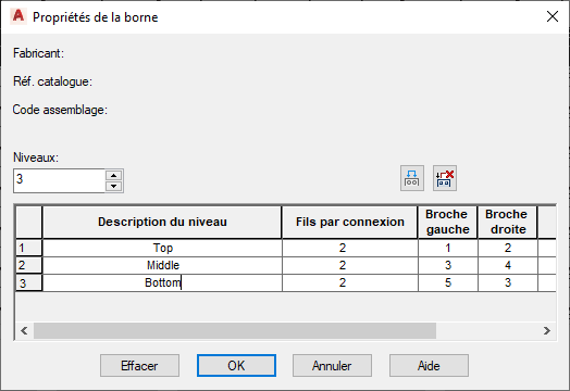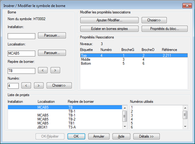 Remarquez dans la boîte de dialogue Insérer / Modifier le symbole de borne, section Propriétés/Associations, que le bloc a désormais trois niveaux. La borne 4 est affectée au niveau supérieur du bloc.