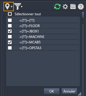 Remarque : Si le projet AutoCAD Electrical toolset n'est pas lié à un projet Inventor, les boutons Affichage de l'emplacement ne correspondent pas à ceux de l'illustration.
