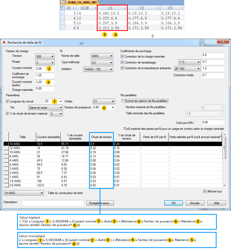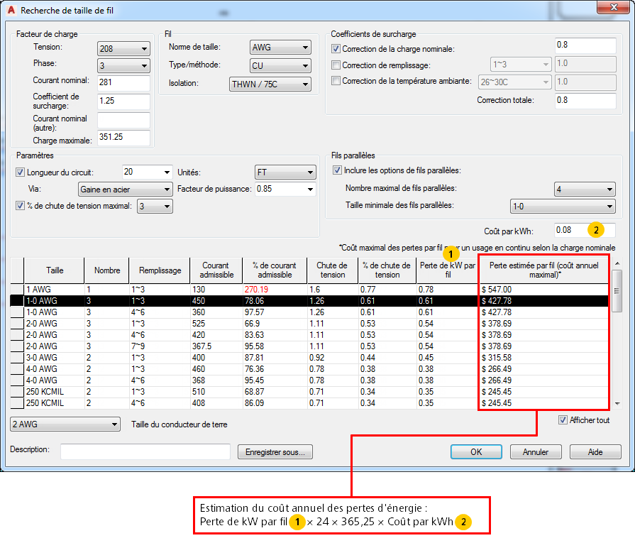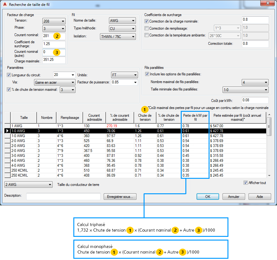 Spécifiez les paramètres de fil et sélectionnez une taille de fil dans la liste des tailles de fil respectant ou dépassant ces paramètres. Les pertes d'énergie estimées par taille de fil permettent de disposer d'informations utiles sur cette sélection.