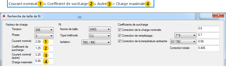 Affiche la charge maximale calculée pour les conducteurs. Elle est basée sur la valeur du courant nominal (autre) ajoutée au produit du courant nominal et du coefficient de surcharge. |