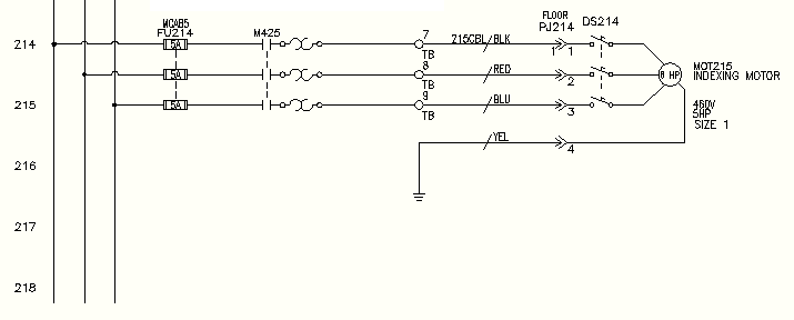 Le fait de déplacer le circuit moteur d'une référence de ligne vers le haut a libéré un peu plus d'espace pour l'ajout d'un nouveau circuit au-dessous. L'étape suivante consiste à étendre la liaison triphasée vers le bas, jusqu'à la référence de ligne 218 et sur la droite pour commencer la construction d'un nouveau circuit moteur.
