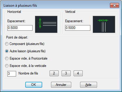 Vous pouvez insérer une liaison triphasée verticale ou horizontale. Une liaison triphasée se coupe automatiquement et se reconnecte à tout composant sous-jacent qu'elle trouve sur son chemin. Si elle croise un câblage existant, des jeux de croisement de fils sont insérés.