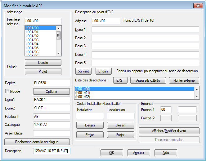 Pour la première adresse d'E/S (I:11/00), sélectionnez la première description (PALLET ENTERING STATION) dans la liste des appareils extraits.
