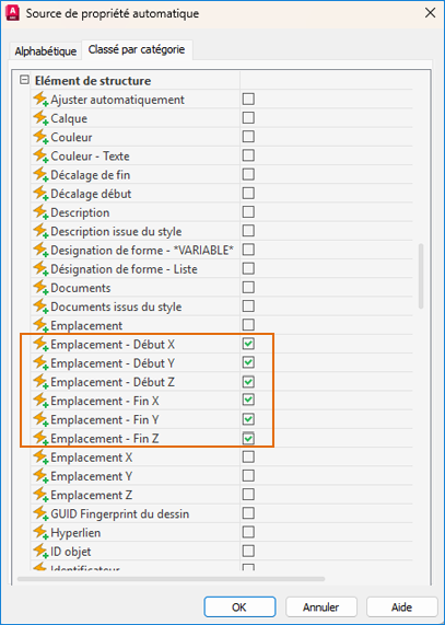 Dans AutoCAD Architecture et MEP 2027, les coordonnées X, Y et Z de début et de fin des éléments de structure peuvent désormais être ajoutées en tant que source de propriété automatique dans la définition des jeux de propriétés.