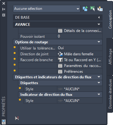Il s'agit des propriétés de l'onglet Conception de la palette des propriétés que vous utilisez pour l'ajout d'objets de tuyauterie.