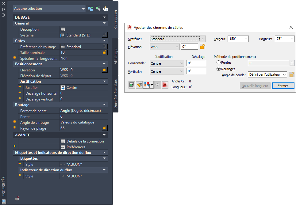 Les outils de chemin de câbles et de tube IRO sont associés à des systèmes spécifiques prédéfinis (par exemple, Alimentation - 120 V ou Données). Le chemin de câbles ou le tube IRO dessiné hérite des propriétés du système (par exemple, les paramètres de conception, les propriétés d'affichage et le style de montée/descente).