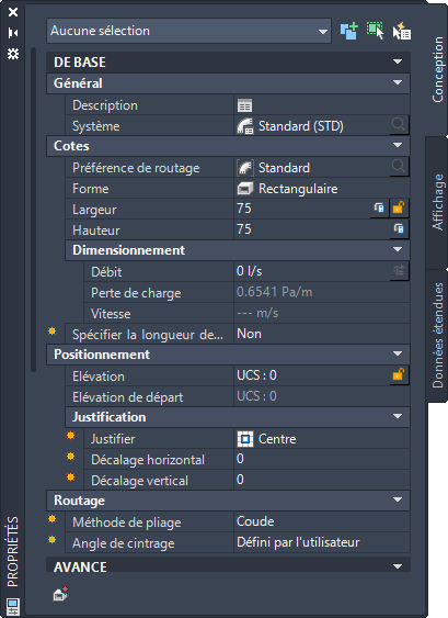 - Si aucune valeur de capacité ne figure dans les boîtes de dialogue Ajout de gaines et Modifier la gaine, les valeurs de perte de charge et de vitesse indiquées correspondent aux valeurs spécifiées pour la définition du système de gaines sous l'onglet Paramètres de conception. Pour définir les paramètres de conception de la définition du système de gaines, reportez-vous à la rubrique Spécification du mode de calcul de la taille de la gaine.