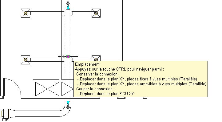 Si l'objet est raccordé à un système, vous pouvez déplacer les objets raccordés dans le plan XY actuel pour conserver la connexion. Les illustrations suivantes montrent comment déplacer les objets de gaine à l'aide des poignées d'emplacement.