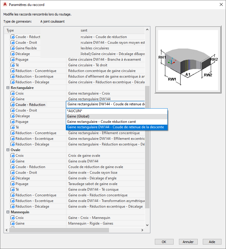 Une préférence de routage de composant de gaine inclut un ou plusieurs intervalles de taille pour les composants de gaine et les raccords, notamment les coudes, les tés, les croix, les piquages et les réductions. Le logiciel organise les intervalles de taille en fonction des tailles nominales des gaines. Vous pouvez utiliser les composants de gaine et les raccords d'un intervalle de taille spécifique lors du positionnement de la conduite de gaine. Les composants de gaines disponibles sont spécifiques au type de connexion que vous sélectionnez. L'exemple suivant montre les préférences de routage pour les connexions de type joint coulissant d'après la forme du profil global.