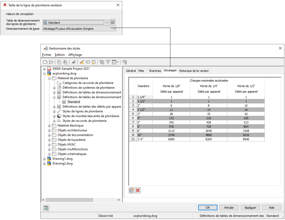 Lorsque vous définissez la conduite sanitaire en tant que décalage ou en tant que tuyaux d'évacuation d'origine, le module de plomberie effectue le calcul de dimensionnement à l'aide des informations de l'onglet Décalages de la table de dimensionnement de ligne de plomberie sanitaire (table de dimensionnement des canalisations), dont les définitions se trouvent dans le gestionnaire des styles.
