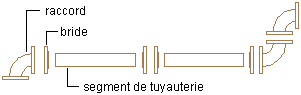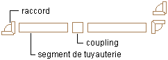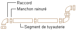 ![]() Raccord sur tuyau : on considère que les raccords et les segments de tuyau sont pourvus d'extrémités à rainures qui permettent le montage d'un manchon. Un manchon est ajouté pour raccorder le raccord au tuyau. Tuyau sur tuyau : un manchon est ajouté pour raccorder les segments de tuyau. Raccord sur raccord : un manchon est ajouté pour relier les raccords. |