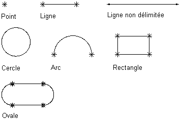 Défini par un centre et un rayon ; contraint par un point de départ et une extrémité.