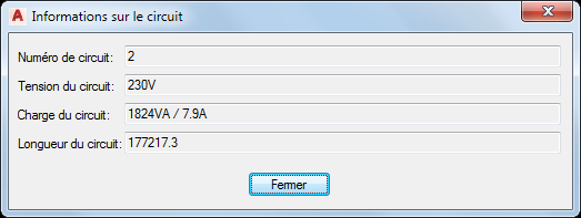 Remarque : Si vous avez chargé à nouveau la base de données du projet d'équipement électrique dans le dessin actuel, la charge du circuit reflète la charge totale de tous les appareils affectés au circuit. Les appareils pris en compte dans le calcul peuvent se trouver dans plusieurs dessins.