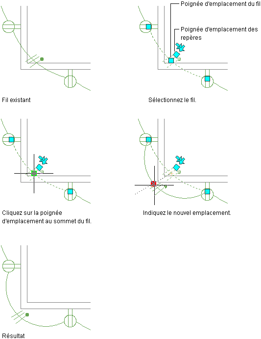 Vous pouvez modifier le positionnement des fils en déplaçant les poignées d'emplacement situées au niveau du sommet. Le but de l'opération est généralement de nettoyer le positionnement en déplaçant les fils le long des murs, des équipements ou des autres géométries de plan d'étage.