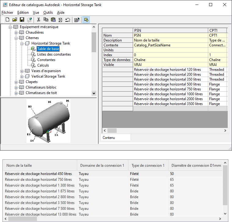 Affichage des tailles de composant dans l'éditeur de catalogues et dans le tableau des tailles de composant de la boîte de dialogue d'ajout