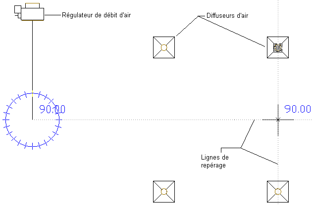 Vue de dessus d'un système 1D simple : un régulateur de débit d'air est raccordé à 4 diffuseurs d'air.