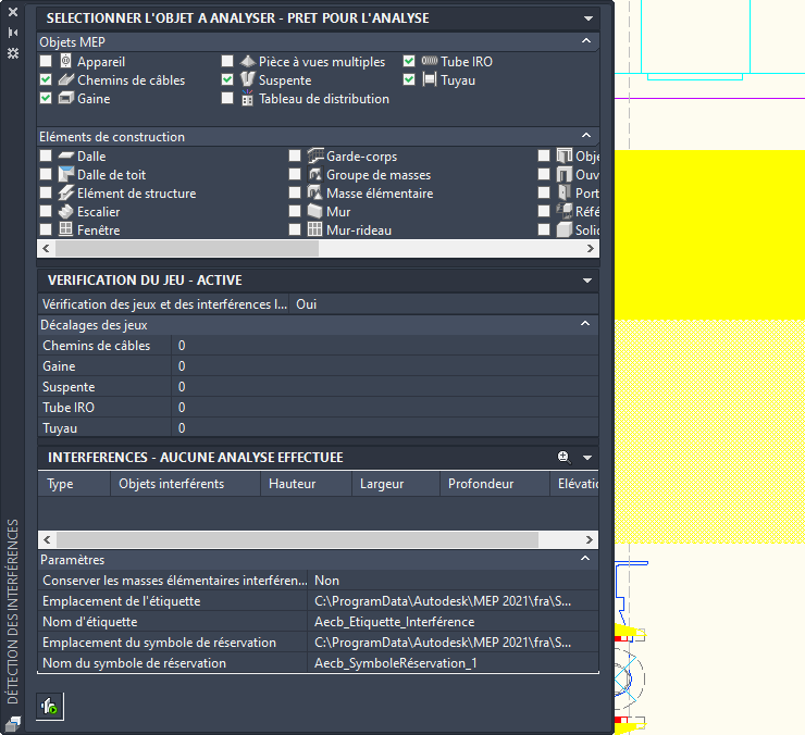 Remarque : Le mode d'analyse des interférences fonctionne indépendamment pour chaque dessin. Si vous accédez à un autre dessin, la palette de détection des interférences est mise à jour avec les informations du dessin actif.