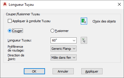 | couper un segment | Activez l'option Couper et entrez une valeur dans le champ Longueur du tuyau. Une autre solution consiste à cliquer sur |