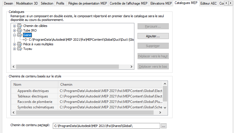 Dans la boîte de dialogue Options, spécifiez les emplacements du contenu (catalogues de composants et contenu basé sur des styles) auquel vous voulez accéder lors du positionnement. Si le contenu est stocké sur votre ordinateur, spécifiez des emplacements locaux dans la boîte de dialogue. S'il est stocké en réseau pour pouvoir être partagé par plusieurs utilisateurs, spécifiez des emplacements réseau.
