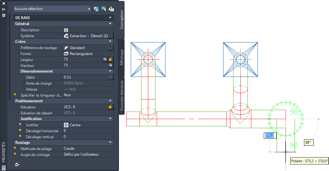 Si vous avez affecté des valeurs de flux à un équipement de sortie, l'outil de dimensionnement en temps réel permet de déterminer les tailles impliquées dans le réseau de gaines lorsque vous dessinez les longueurs de gaine. Par ailleurs, vous pouvez utiliser cet outil si vous modifiez les longueurs de gaine existantes.