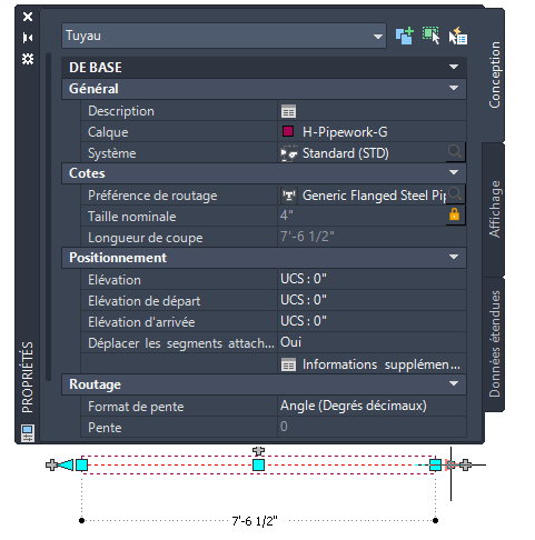 La longueur d'un segment de tuyau est modélisée avec précision à l'aide de joints distincts. La longueur de coupe dans la palette des propriétés correspond à la longueur réelle du tuyau et inclut les profondeurs nécessaires à l'insertion des brides.