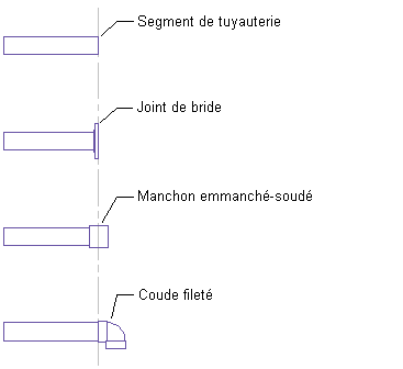 La troisième et la quatrième illustration représente d'autres raccords connectés à l'extrémité du tuyau. Si vous ajoutez un manchon, le milieu du manchon se situe au niveau de l'extrémité du tuyau d'origine. L'extrémité du tuyau est déplacée vers la face de manchon adjacente. Un coude est inséré à l'extrémité du tuyau et cette dernière occupe la même position. La longueur du tuyau reste la même, mais la longueur de coupe augmente, car la valeur CEL du coude s'additionne à la longueur. Pour chacune des connexions affichées ci-dessus, les longueurs de coupe de tuyau qui en résultent sont toutes différentes de la longueur du tuyau d'origine.