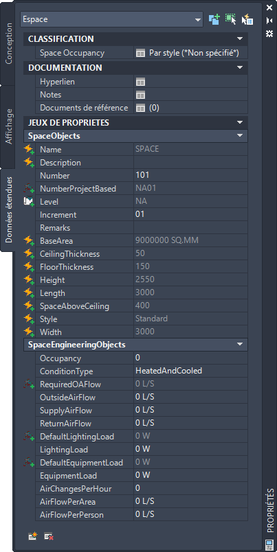 Notez que la propriété DébitAirExtRequis (débit d'air d'occupation) ne peut être modifiée. Sa valeur est automatiquement calculée lorsque vous spécifiez un type de pièce dans Occupation de l'espace et le nombre d'occupants dans Occupation.