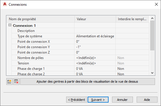 | centrer la connexion sur l'appareil | Cliquez sur Ajouter des centres à partir des blocs de visualisation de la vue de dessus. |