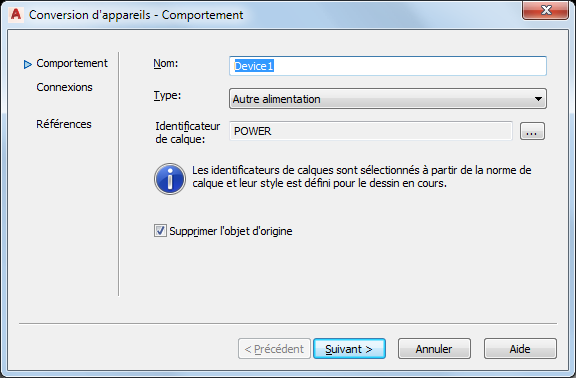 A l'aide des paramètres que vous avez spécifiés et avec le bloc AutoCAD ou le bloc de visualisation actuellement assigné au bloc à vues multiples ou à la pièce à vues multiples, le logiciel crée un style d'appareil et un appareil. Toutefois, le style d'appareil contient d'autres paramètres que vous pouvez également configurer. Par exemple, vous pouvez sélectionner une méthode de nettoyage des fils différente de celle par défaut. Vous pouvez également modifier les définitions de visualisation par défaut.