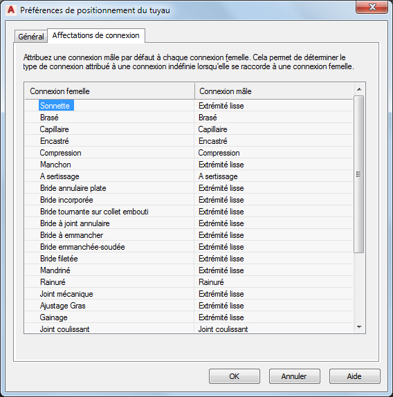 Tout type de connexion indéfini rattaché à un type de connexion femelle dans un dessin s'affiche en tant que connexion mâle et reflète la sélection effectuée dans cette boîte de dialogue.
