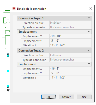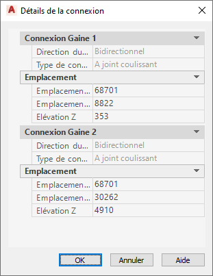 La fiche de travail Détails de la connexion affiche les propriétés suivantes en fonction de l'objet sélectionné. L'emplacement et l'élévation sont les seules propriétés modifiables.