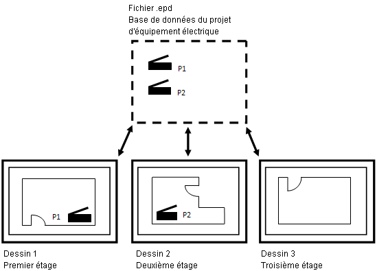 La base de données du projet d'équipement électrique est obligatoire pour tous les dessins contenant des circuits. Elle peut être spécifiée à tout moment, avant ou après la création des circuits. Si vous n'avez pas spécifié de base de données de projet d'équipement électrique au moment de l'ajout de circuits au dessin, vous devrez alors spécifier le nom d'un fichier de base de données de projet d'équipement électrique.