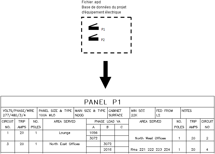 Dans les documents de construction, les nomenclatures de tableaux sont créées à partir de la base de données du projet d'équipement électrique. Les données de circuit proviennent directement de la base de données du projet d'équipement électrique.