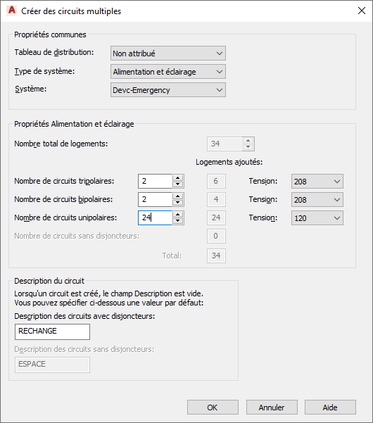 - Dans la zone Propriétés de <type de système>, spécifiez le nombre de circuits unipolaires, bipolaires et tripolaires ainsi que les tensions correspondantes.