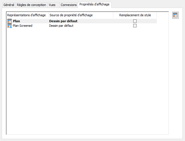 | modifier l'affichage des composants du style d'un objet, comme la visibilité, le calque ou la couleur | Sélectionnez la représentation d'affichage, cliquez sur Remplacement de style et modifiez les propriétés d'affichage du composant. |