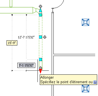 Les poignées, représentées par des formes remplies de petite taille, se trouvent à des endroits stratégiques de l'objet sélectionné. Servez-vous des poignées pour modifier un objet de nombreuses façons. Par exemple, les poignées vous permettent d'allonger ou de pivoter l'objet ou encore de modifier son élévation ou de le changer de place. Les poignées permettent de créer rapidement une gaine, un tuyau, un chemin de câbles ou encore une tube IRO.