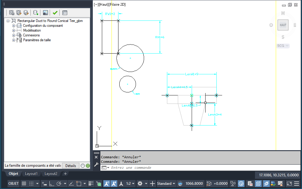 Le générateur de contenu fait appel à l'environnement de travail paramétrique si vous choisissez de créer ou de modifier un composant paramétrique. L'exemple suivant représente le Générateur de contenu affichant une gaine rectangulaire de té de taraudage rond conique. Pour plus d'informations, reportez-vous à la rubrique Lancement du générateur de contenu.