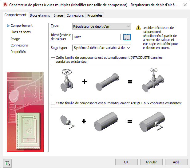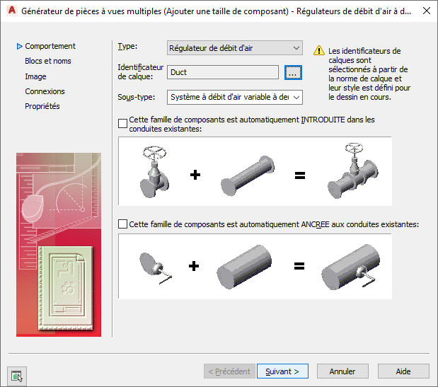 - Vous créez des composants basés sur les blocs ou ajoutez de nouvelles tailles aux familles de composants. L'assistant vous aide à définir le comportement du composant, les tailles des composants, les blocs AutoCAD utilisés pour représenter chaque taille de composant, les images d'aperçu facilitant la sélection du composant, les connexions et les informations sur le jeu de propriétés. Pour plus d'informations, reportez-vous à la rubrique Lancement du générateur de contenu pour la création d'une pièce à vues multiples.