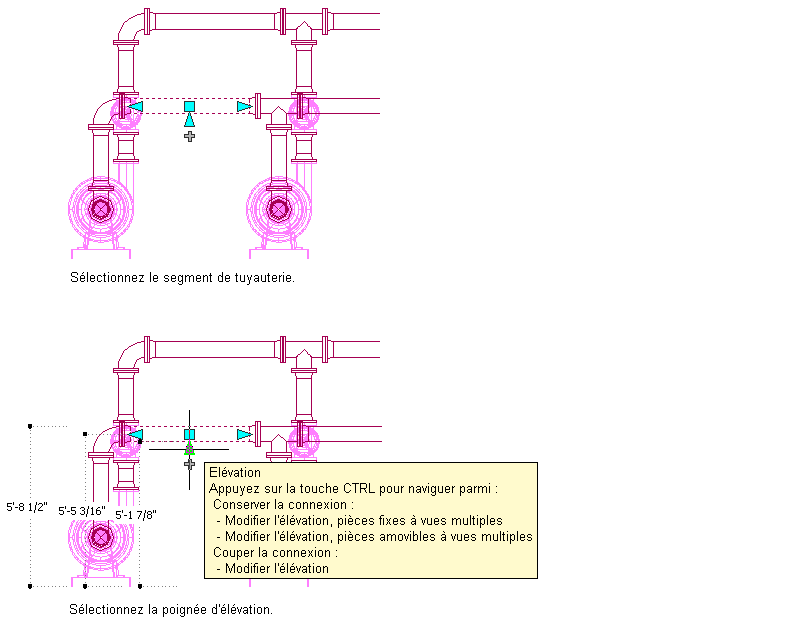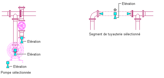 ) permettent de modifier l'élévation de composante et de segments de tuyau dans la vue modèle, par rapport au dessus, au trait d'axe ou au dessous du segment.