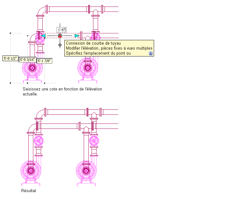 L'exemple suivant représente la modification d'élévation d'un segment de tuyau. Comme l'espace libre n'est pas suffisant pour accéder aux volants de commande de la vanne, il convient de relever un segment de tuyau horizontal d'une valeur de cote relative à son élévation actuelle. Le logiciel ajuste en conséquence la position des objets raccordés tout en maintenant leur connectivité.