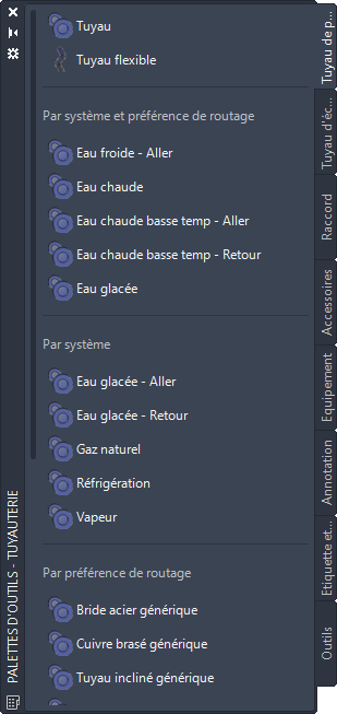 Dans l'espace de travail Tuyauterie, cliquez sur l'onglet Débutgroupe de fonctions Constructionliste déroulante OutilsOutils pour afficher la palette d'outils Tuyauterie.