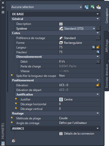 | *Débit | Le débit est obtenu des pièces à vues multiples raccordées à la conduite de gaine ou il peut être saisi. | 0 (par défaut). Le débit sera automatiquement mis à jour si la gaine est connectée à une pièce à vues multiples. |