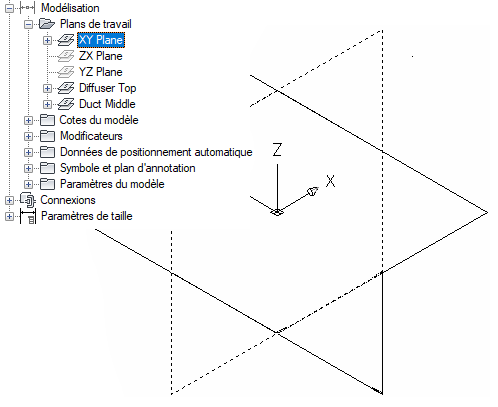 Cette procédure permet d'ajouter des plans de travail pour créer la géométrie, les trajectoires et les contraintes d'un modèle. Pour plus de clarté, ne travaillez qu'avec un seul plan dans la mesure où vous n'utilisez pas de plans de travail de décalage et de référence. Les instructions suivantes se rapportent au navigateur de composants. Le navigateur de composants se trouve sous le ruban à la gauche de la zone de dessin.